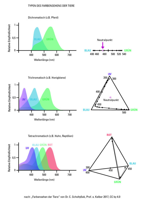 Einer dieser Typen nimmt Bereiche des UV-Spektrums wahr – insbesondere UV-A. Damit liegt auch der sogenannte „Weißpunkt“ oder Neutralpunkt, an dem etwas farblos/neutral erscheint, anders, als bei Trichromaten (z.B. Mensch) oder Dichromaten (z.B. Pferd).